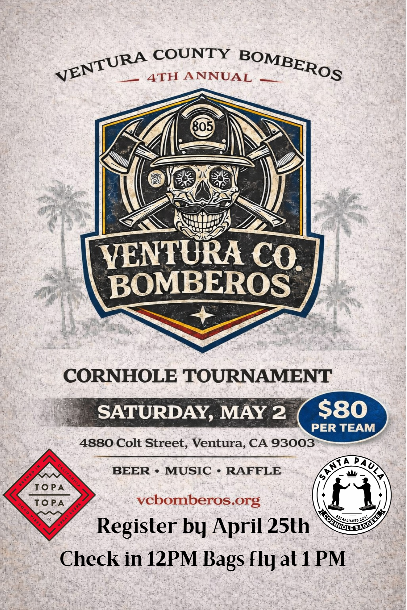 We are hosting our 4th annual Cornhole Tournament/Fundraiser to help support our scholarship fund which supports students attending the Oxnard College Fire Academy, and starting this year the Wildland Academy. Tournament will be 2 game round robin followed by a 2 game elimination. Bring your skills. Each entry covers participation for both players.